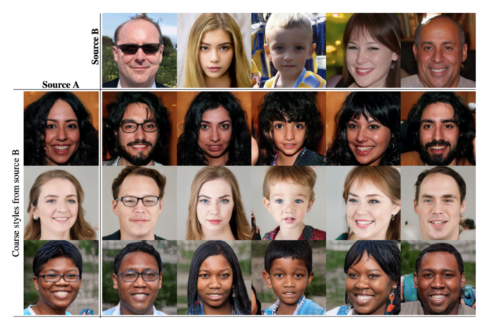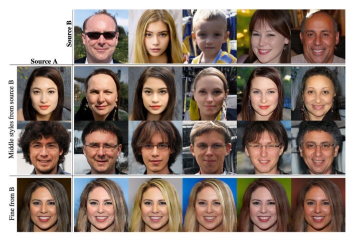 아래와 같이 이미지 "소스 B"를 생성하는 잠재 요소를 사용하여 거친 공간 해상도(4x4 ~ 8x8) 스타일을 유도하고 "소스 A"의 스타일을 사용하여 더 미세한 공간 해상도를 만듭니다. 따라서 생성된 이미지는 소스 B의 포즈, 일반적인 헤어스타일, 얼굴 모양 및 안경과 같은 높은 수준의 스타일을 가지면서 모든 색상(눈, 머리카락, 조명) 및 미세한 얼굴 특징은 A와 유사합니다.