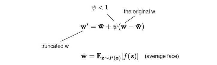 따라서 이미지를 생성할 때 이러한 영역을 피하여 변형을 희생시키면서 이미지 품질을 향상시킬 수 있습니다. 이것은 z 또는 w 를 잘라서 수행할 수 있습니다 . StyleGAN에서는 다음을 사용하여 w 에서 수행됩니다 .