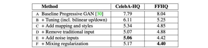 StyleGAN 논문에서는 Progress GAN 네트워크 설계( 세부 사항 )로 시작하여 Adam 최적화 프로그램을 포함한 많은 하이퍼파라미터를 재사용합니다. 그런 다음 연구원은 모델 성능이 개선되었는지 확인하기 위해 설계 변경을 실험합니다.