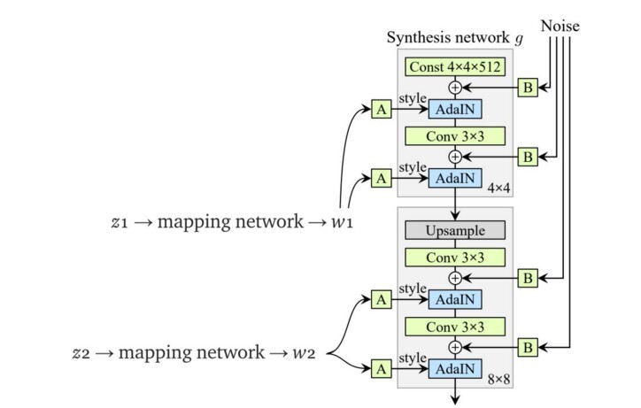 - StyleGAN에서는 매핑 네트워크라는 딥 네트워크를 적용하여 잠재 z 를 중간 잠재 공간 w 로 변환합니다 .