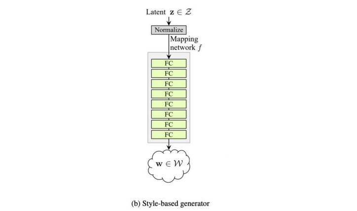 - StyleGAN은 8개의 완전히 연결된 레이어(FC)를 사용하여 z 를 이 중간 잠재 공간으로 변환하기 위해 매핑 네트워크 f 를 도입합니다 . w 는 새로운 z ( z ') 로 볼 수 있습니다 . 이 네트워크를 통해 512-D 잠재 공간 z 는 512-D 중간 잠재 공간 w 로 변환됩니다 .