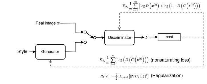 FFHQ(사람 얼굴 데이터 세트 — Flickr-Faces-HQ)는 연령, 민족, 이미지 배경 및 안경, 모자 등과 같은 액세서리와 같은 더 나은 적용 범위를 가진 CelebA-HQ에 비해 더 높은 품질의 데이터 세트입니다. StyleGAN에서는 CelebA-HQ 데이터 세트는 손실 함수로 WGAN-GP를 사용하여 훈련되는 반면 FFHQ는 아래의 R₁ 정규화와 함께 포화되지 않은 GAN 손실을 사용합니다.