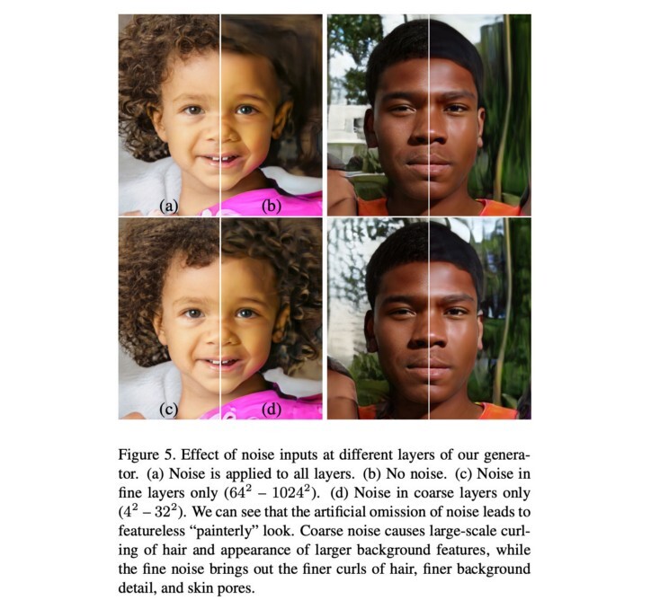 -> b) noise 생략은 featureless 하게 만들고, 회화적으로 보이게 만들고, d) coarse noise 는 라지스케일의 헤어 컬링과 더 큰 배경 피쳐의 모습을 만들어내고, c) fine noise 는 더 정교한 헤어 컬과, 정교한 배경 디테일, 피부 모공까지 표현하다는 걸 알수 있습니다.